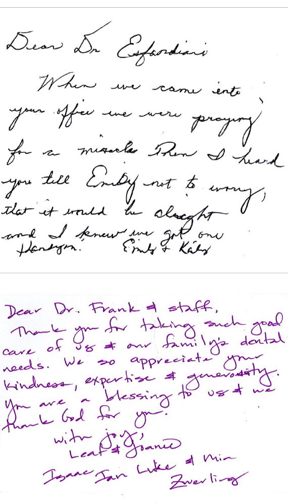 I visited Dr.Esfandiari this month.what an amazing dentist! For the first time in my life I left a dentist office feeling so blessed to have found such a professional. Dr.Frank made me feel so welcome and calm. He took such great care of me. I highly recommend this practice if you are in need of a dentist that is in our neighborhood ....and is kind., caring and generous with his time. Don't be afraid any longer!